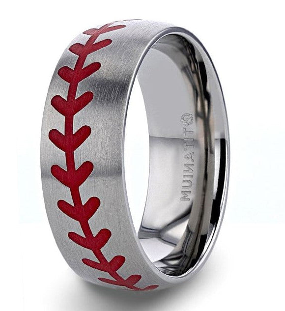 The Dimaggio Titanium Brushed Finish Ring with Red Baseball Stitching Pattern 8mm